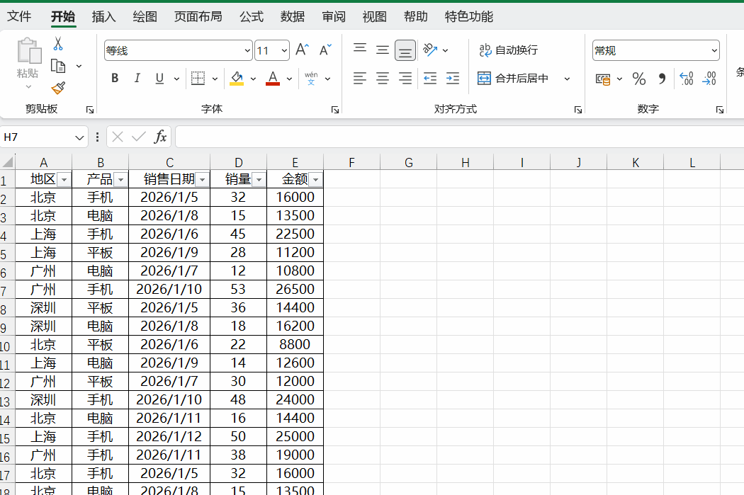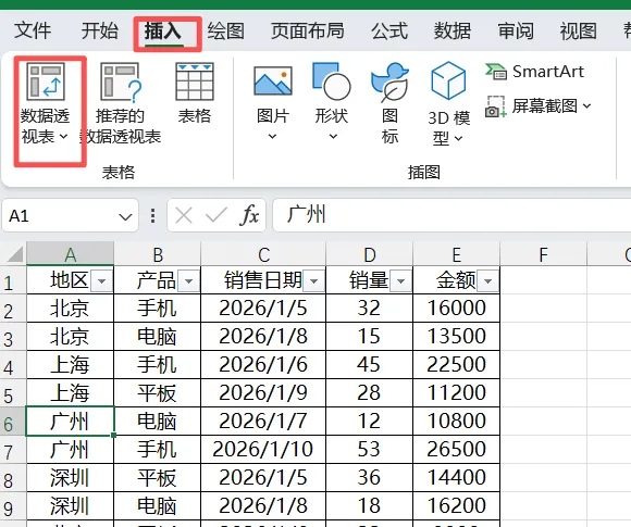 点击原始数据区域的任意一个单元格(不用全选,Excel会自动识别数据范围),比如选中“地区”列的任意单元格。