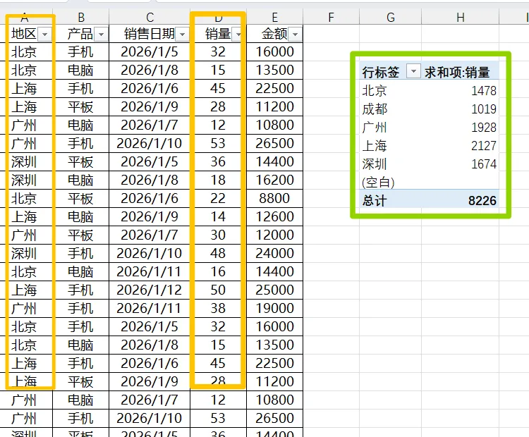 举个实操案例:要统计“各地区各产品的总销量”,只需: