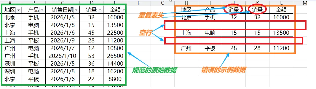 坑2:表头重复 → 解决方法:修改重复的表头(比如把“销量1”“销量2”改为“手机销量”“电脑销量”);
