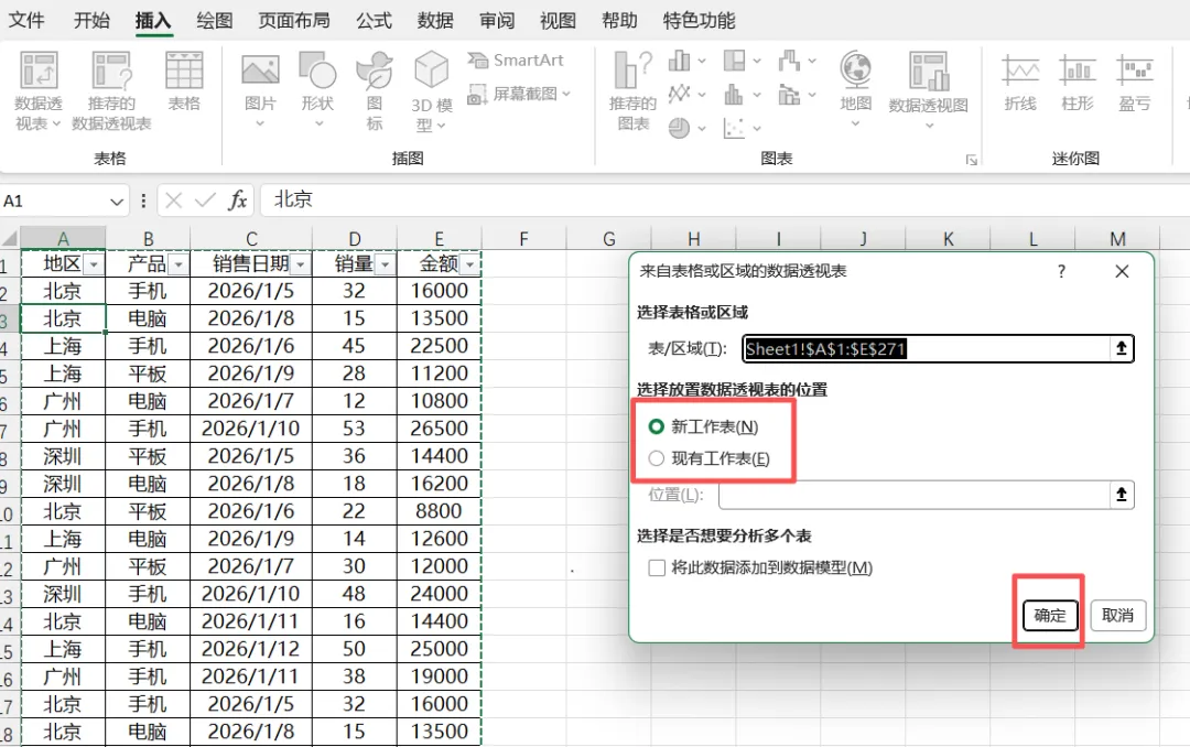 对话框里默认会自动填充“表/区域”(就是你选中的数据范围),无需修改;“选择放置数据透视表的位置”,新手建议选【新工作表】(避免覆盖原始数据),点击【确定】。