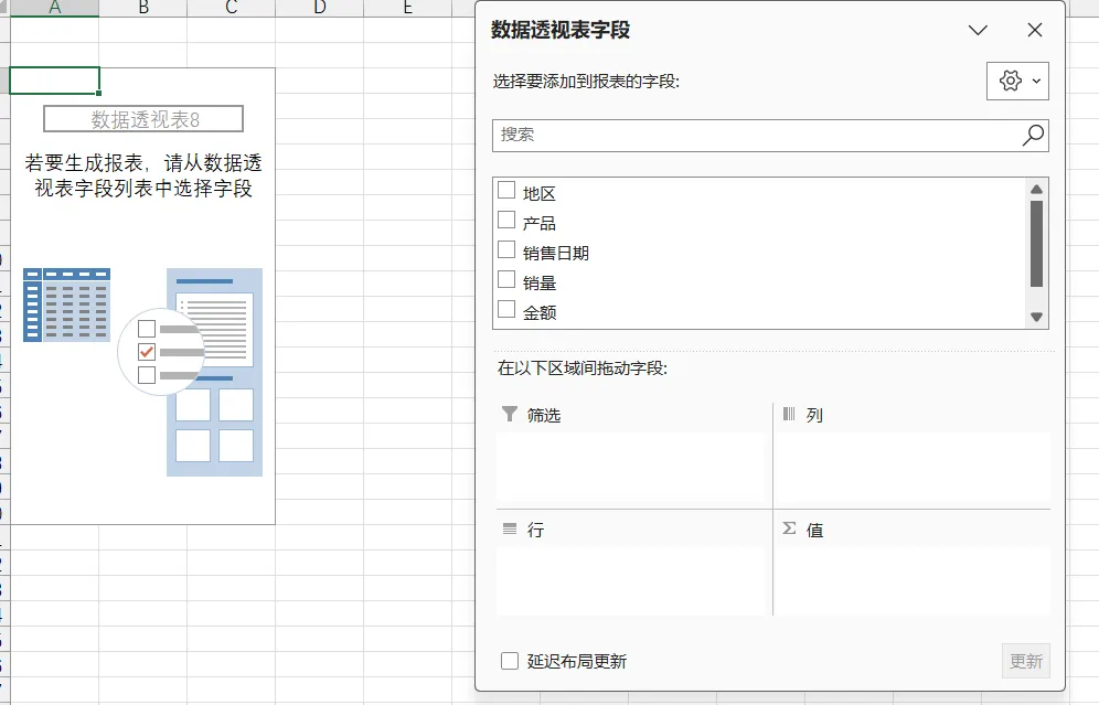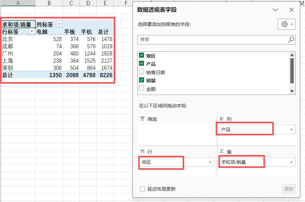 右侧字段窗口里,会显示你原始数据的所有表头(比如“地区”“产品”“销量”“金额”),我们只要把这些字段,拖动到下方的4个区域里,就能生成报表: