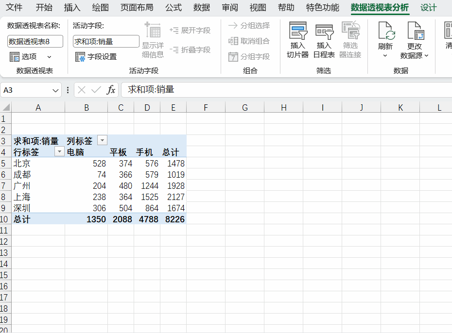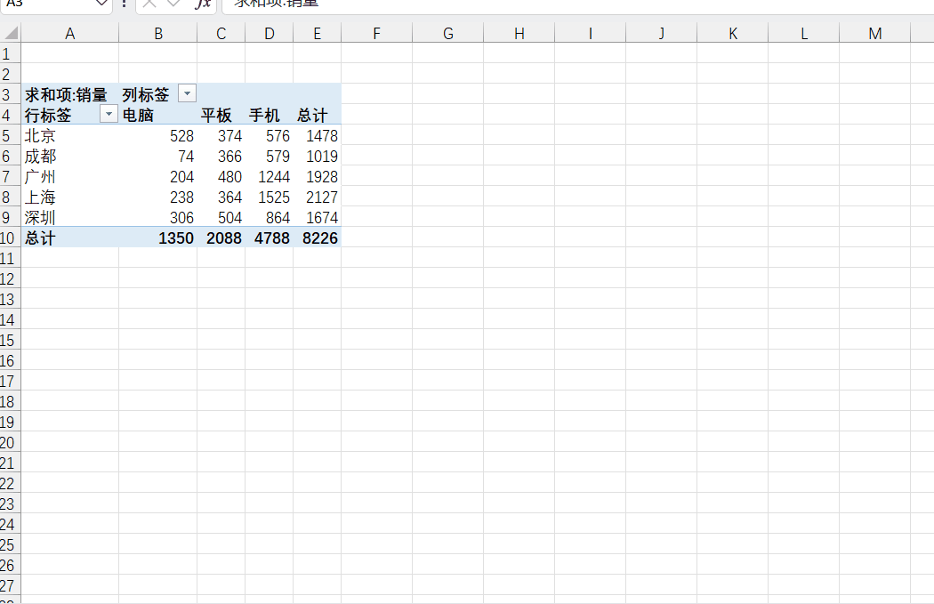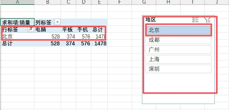 生成切片器后,点击任意选项(比如“北京”),透视表会自动筛选出北京地区的所有数据,再点击“手机”,就能筛选出“北京地区手机的销量”,联动效果拉满!