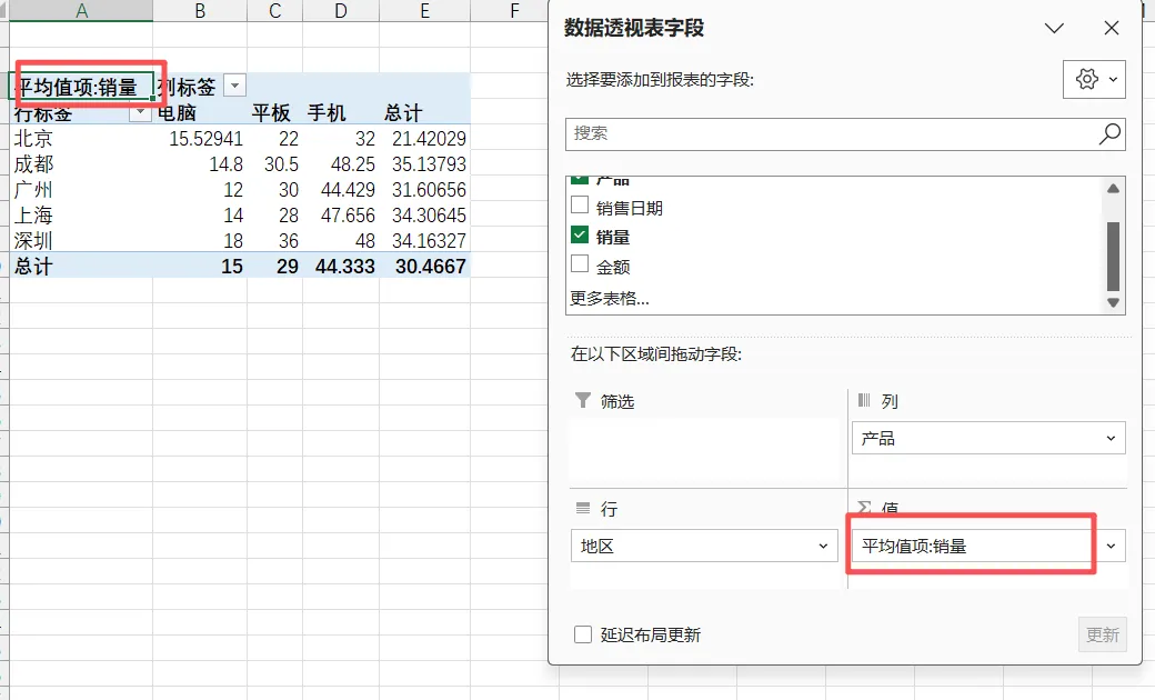 ps:数据透视表中的每个字段在“值”里面可以重复使用,如针对销量字段可以用来求和,同时可以用来求平均值、计数等,几次重复就会有几列数据。
