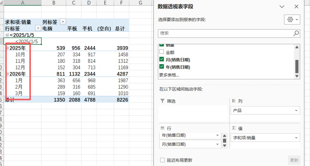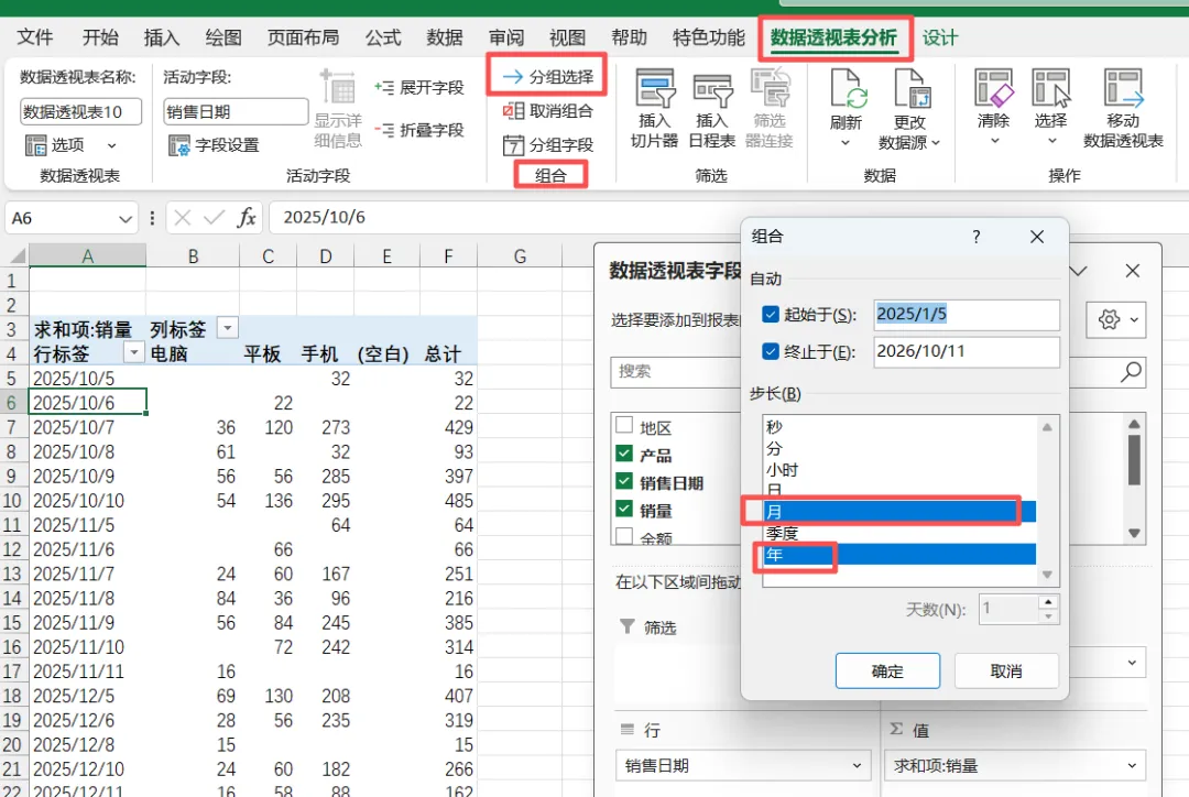 如果你的数据包含日期字段(比如“销售日期”),想按“年份”“季度”“月份”统计数据,不用手动分类,透视表的“日期组合”功能就能一键搞定。