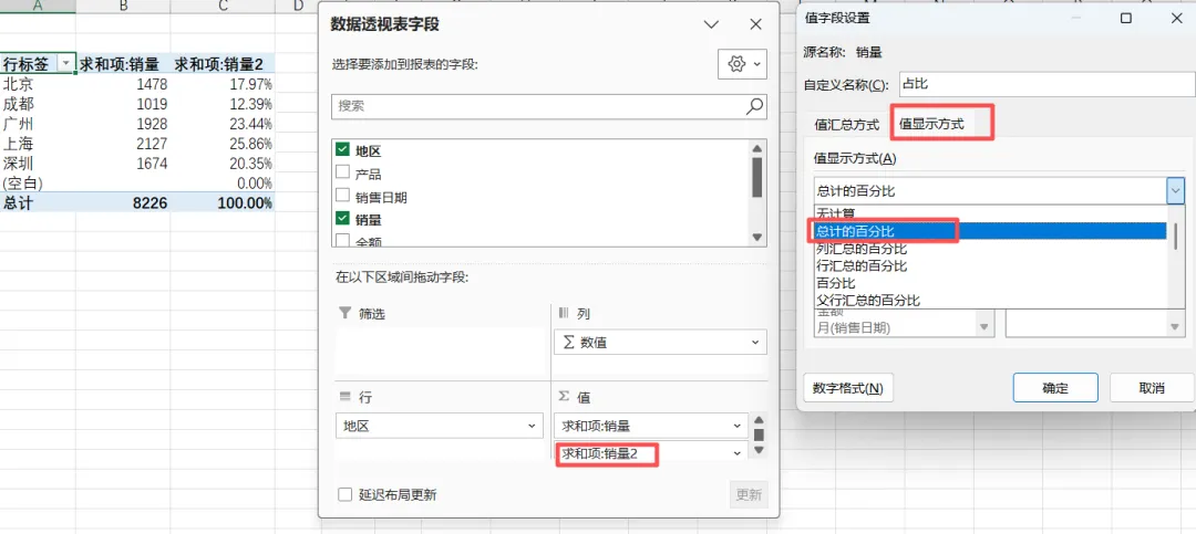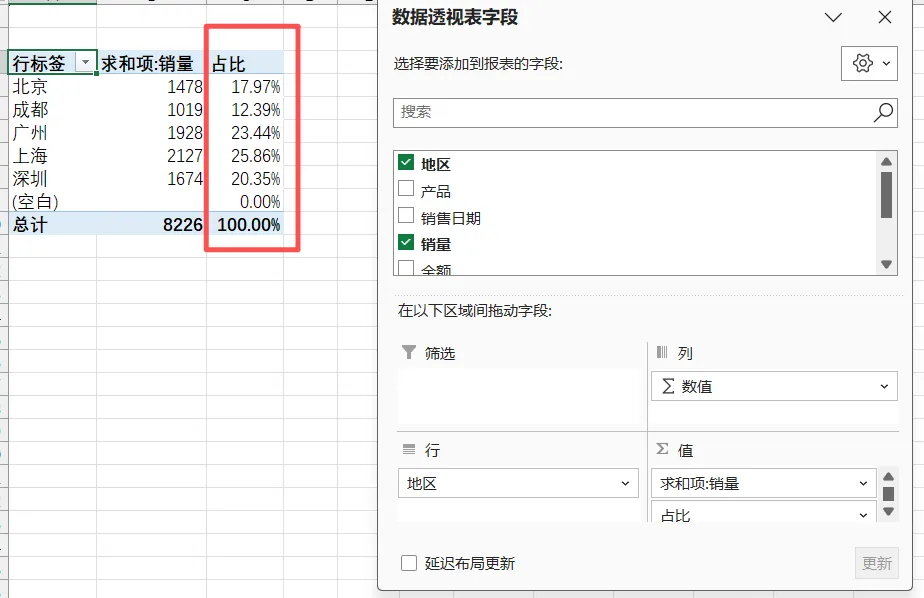 有时候,我们不仅需要知道“具体数值”,还需要知道“各部分占比”(比如各地区销量占总销量的比例),透视表能一键生成占比,不用手动计算。
