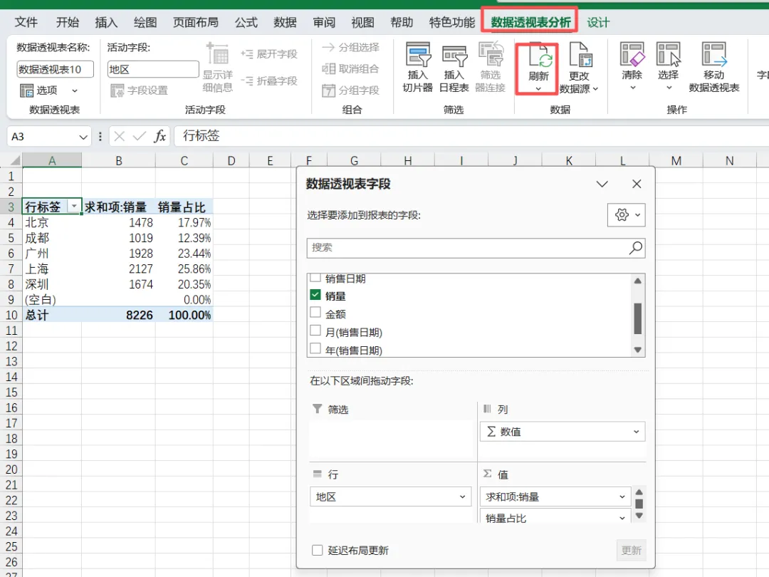 最实用的功能之一!如果原始数据更新了(比如新增了几条销售记录、修改了某个销量数值),不用重新创建透视表,一键刷新就能同步更新报表,避免重复工作。