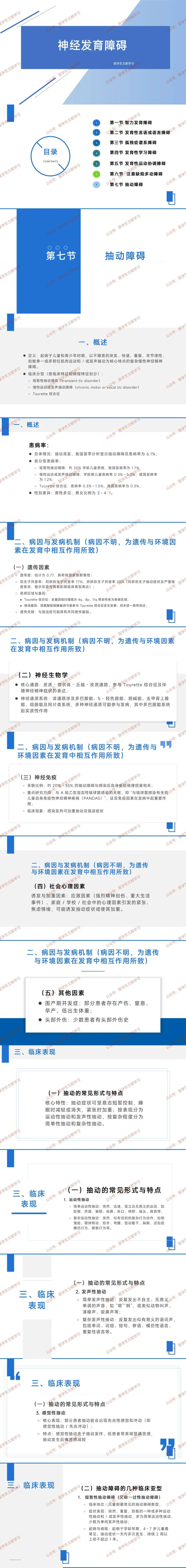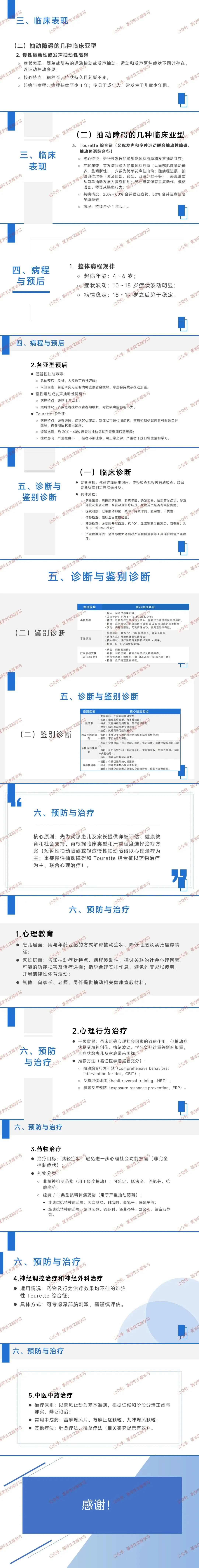 Tourette:缓慢进展,症状波动,30%~40% 青春期后期缓解;严重程度不一,轻者正常上学,重者干扰生活学习。