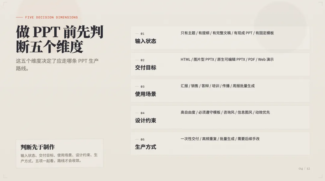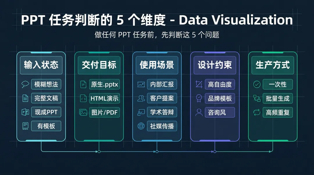 这 7 条覆盖了我能想到的所有 PPT 任务。它们的核心问题只有一个:你要交付的是「视觉保真的成品」,还是「原生可编辑的 PowerPoint 文件」?