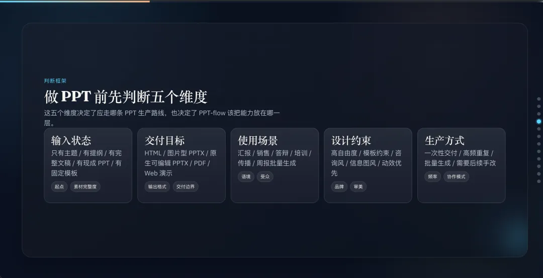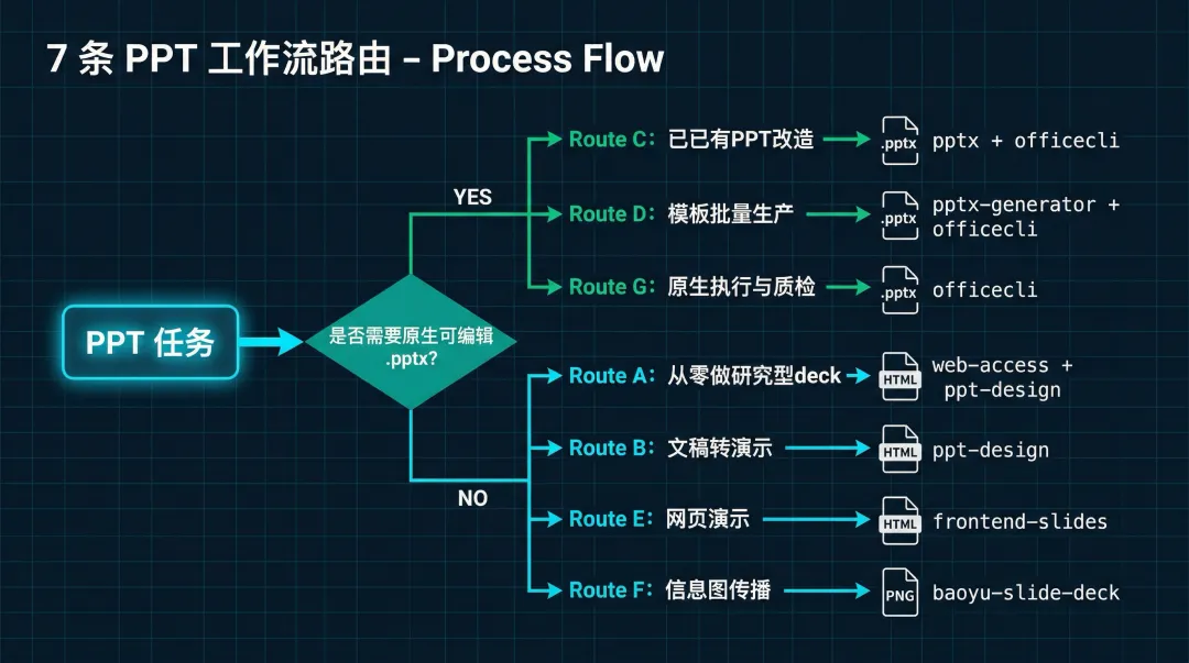 这比做一个「大而全的万能 PPT Skill」靠谱得多。不同场景,不同链路,各自发挥优势。