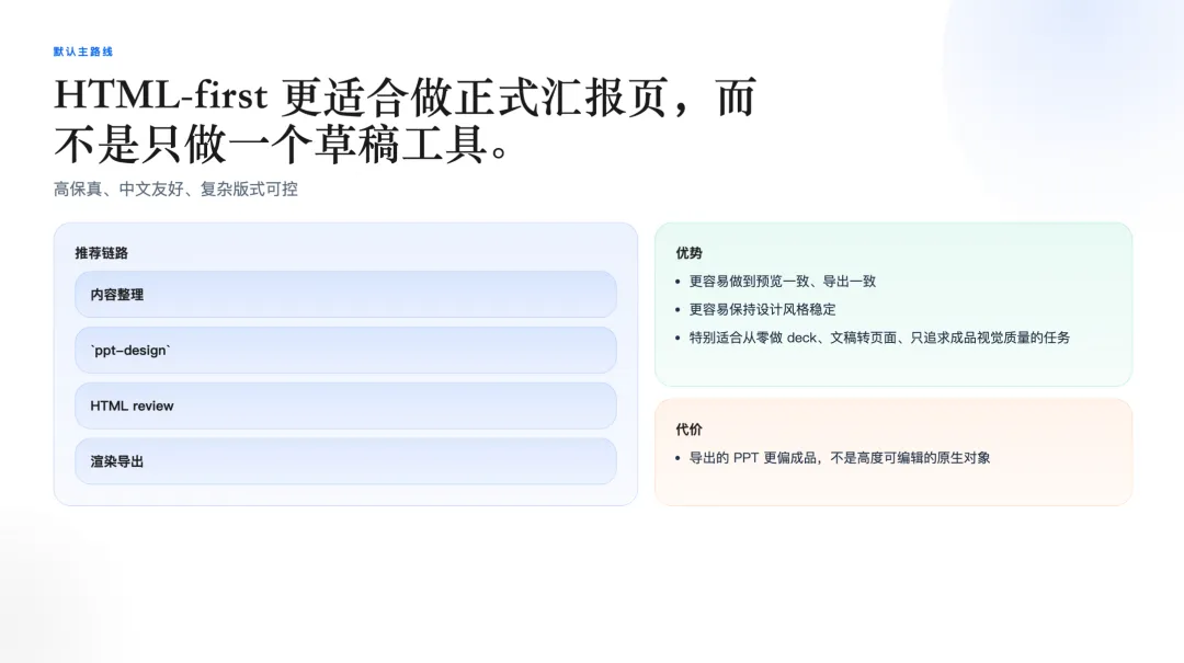 这条路线的好处是中文排版友好、复杂版式稳定、导出和预览高度一致。缺点是导出的 PPT 是成品照片,不是可编辑的原生对象。