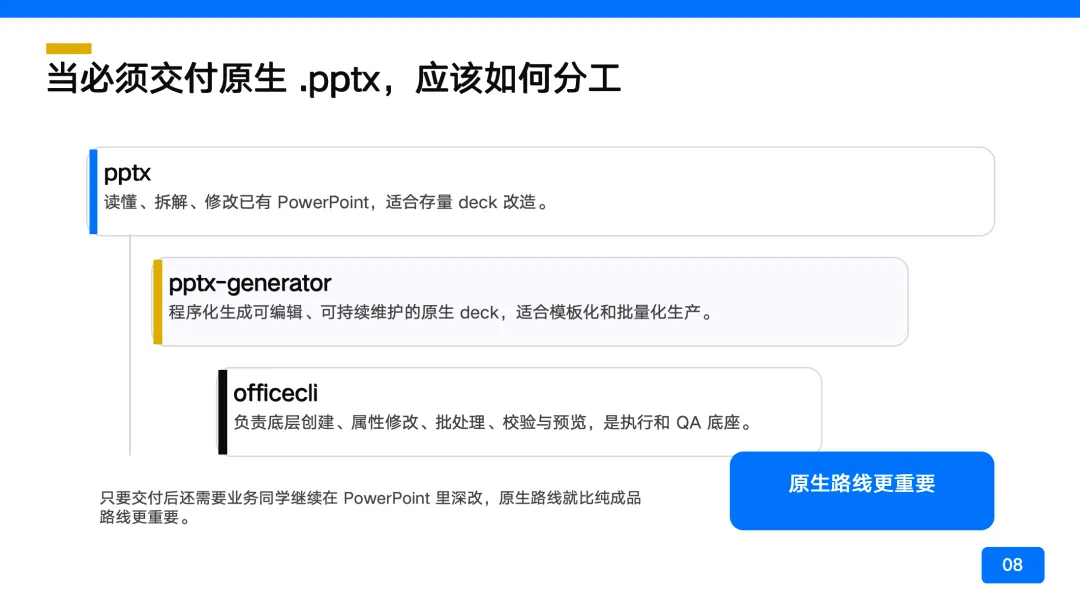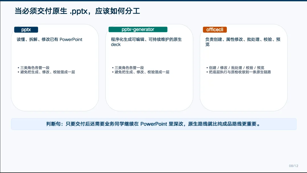 这条路线需要几个角色配合:pptx 类工具负责读取和修改已有文件;pptx-generator 类工具用代码从零生成 deck;officecli 类工具做底层执行和质检。三个不是竞争关系,是分工协作。