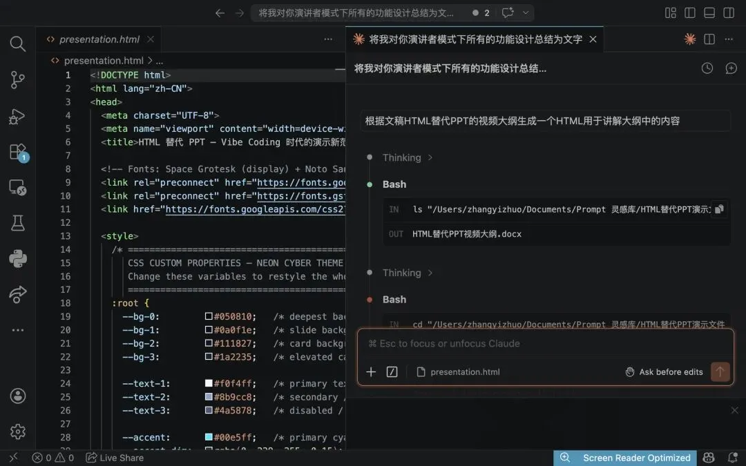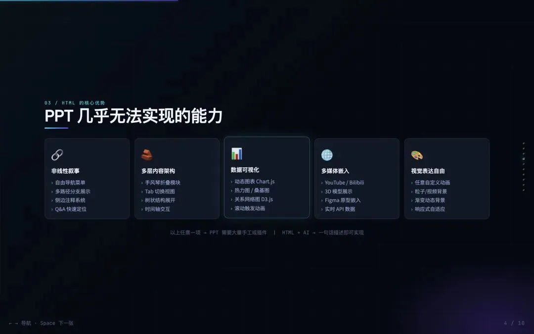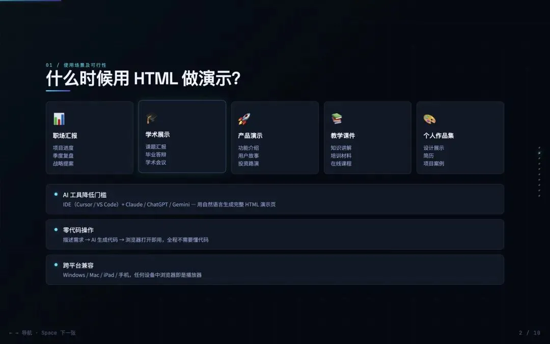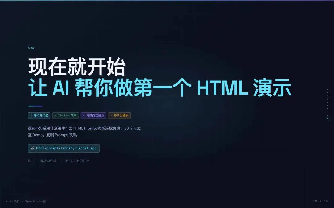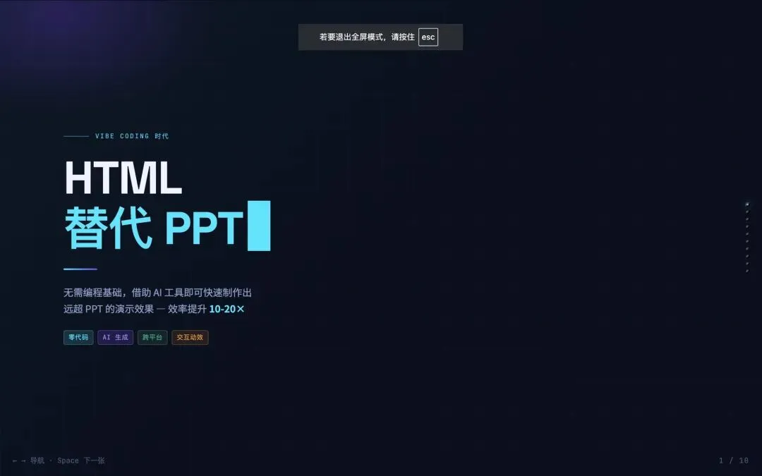 你还在手搓PPT吗?在Vibe Coding时代,无需编程基础,借助AI工具和即可快速通过HTML制作出远超PPT的演示效果。