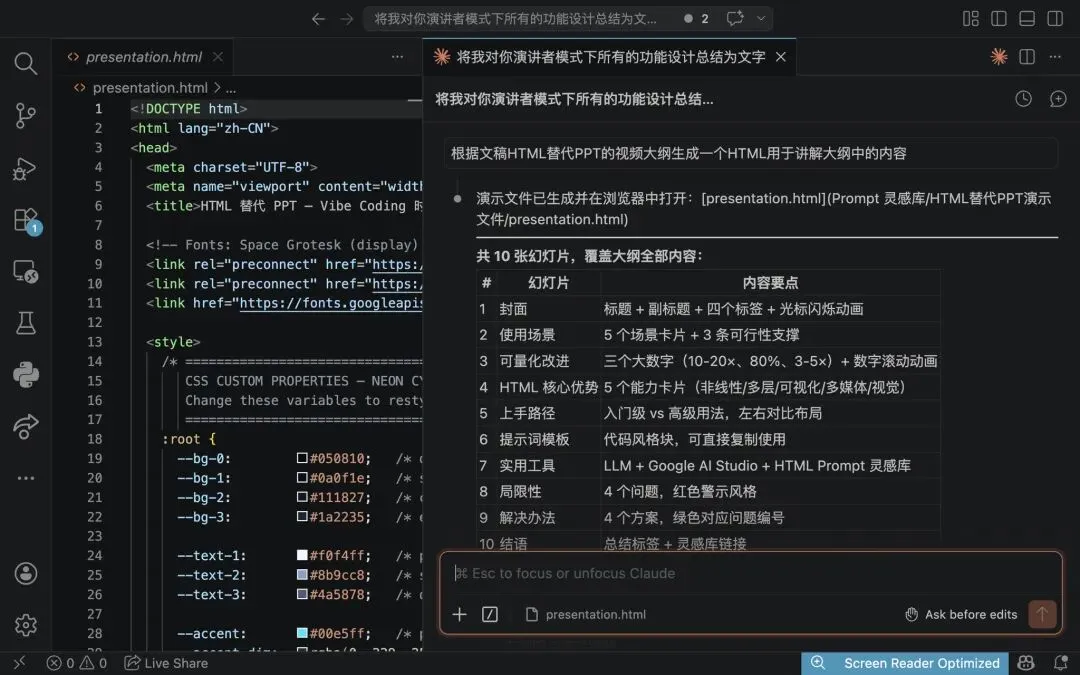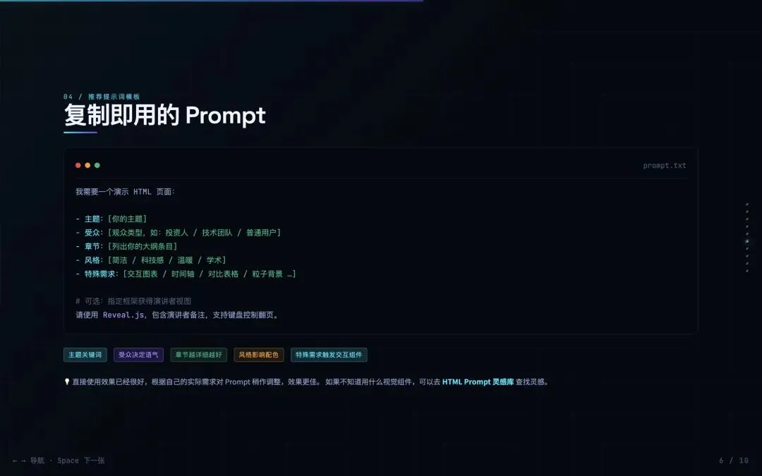 - 复制生成的代码 → 新建 presentation.html → 粘贴 → 浏览器打开