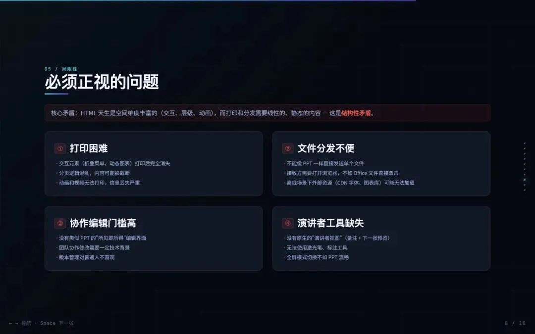 HTML天生是空间维度丰富的(交互、层级、动画),而打印和分发需要线性的、静态的内容
