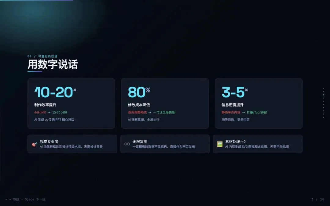 - 制作时间:传统PPT精心排版 4-8小时 → AI生成HTML 15-30分钟,效率提升10-20倍