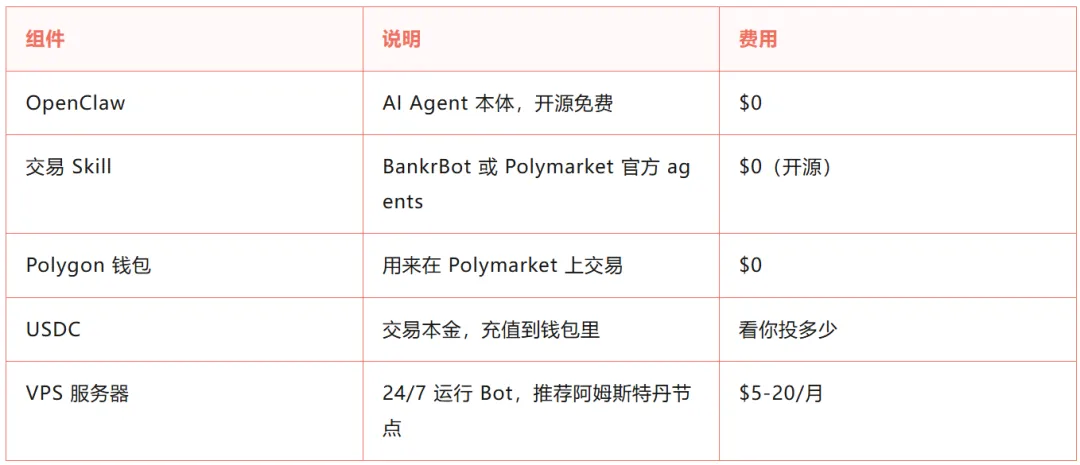 先说说懂代码的路线,核心是搭建一套基础设备,成本很低,甚至大部分组件都是免费的:需要OpenClaw(AI Agent本体,开源免费)、交易Skill(开源免费)、Polygon钱包(免费)、USDC交易本金(多少看自己的预算),以及一台24小时运行的VPS服务器(每月5-20美元,推荐阿姆斯特丹节点,因为延迟最低,而延迟在套利里就是真金白银)。