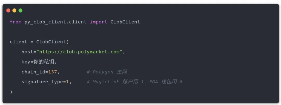 这里有两个必避的坑:一是初始化客户端时,signature_type一定要设对(MagicLink账户用1,EOA钱包用0);二是下单必须用create_and_post_order函数,另一个create_order函数只在本地创建订单,不会提交到交易所,很多人第一次失败就是踩了这个坑。