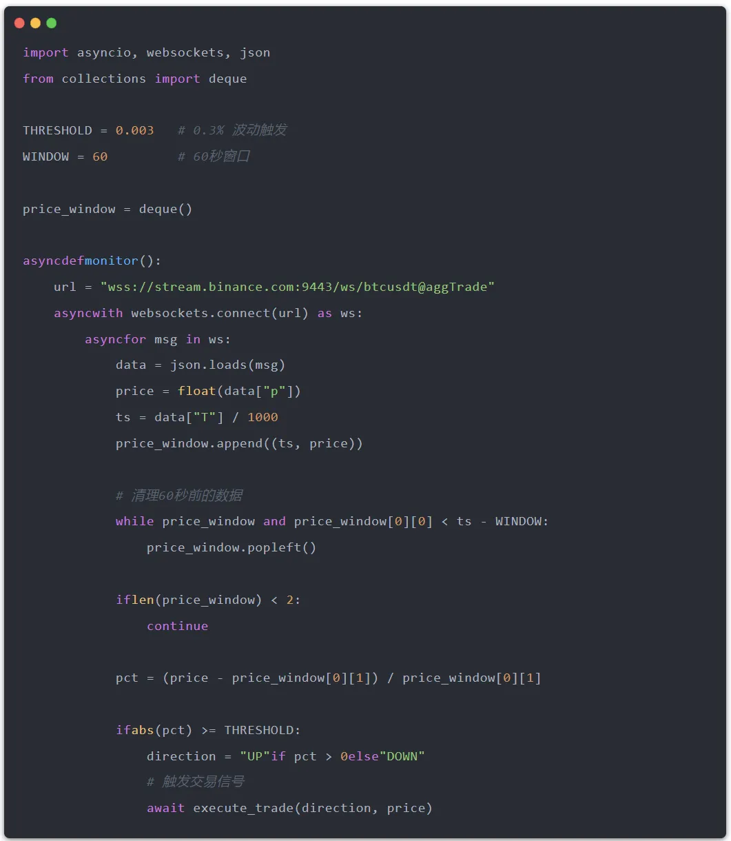 如果做延迟套利,还需要搭建信号层——用Binance的WebSocket实时抓取BTC价格。