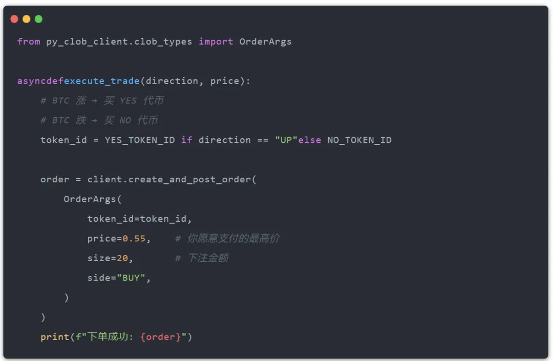 设定好波动阈值(比如60秒内波动超过0.3%就触发交易),再写一段执行代码,让Bot在收到信号后自动买入对应方向的代币。这里还有一个关键提醒:side参数永远填BUY,因为在Polymarket上,做空某个方向不是“卖出YES”,而是“买入NO”。