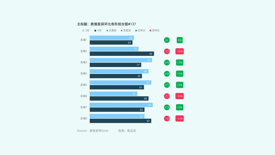 适用于两组数据,多指标对比可视化展示,可以是差异值、环比、完成率等多种指标。