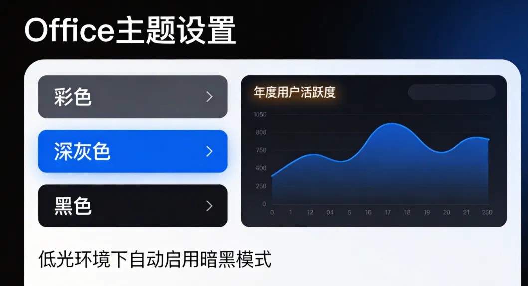 设置Office主题:文件 > 账户 > Office主题,选择"黑色"或"深灰色"