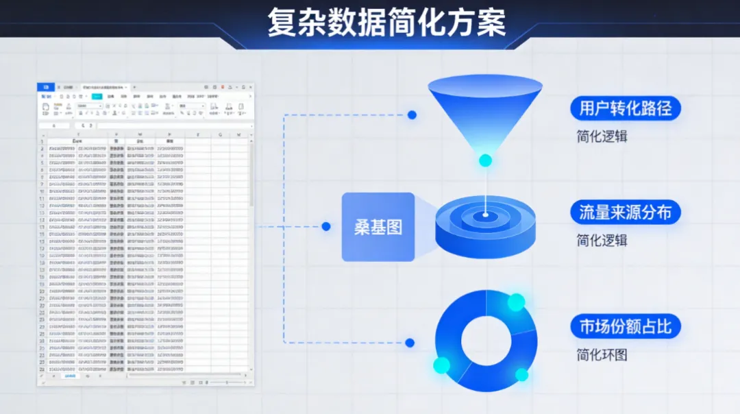 选择简化图表:用圆环图代替饼图,用桑基图展示流程,用简化漏斗显示转化