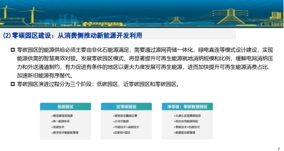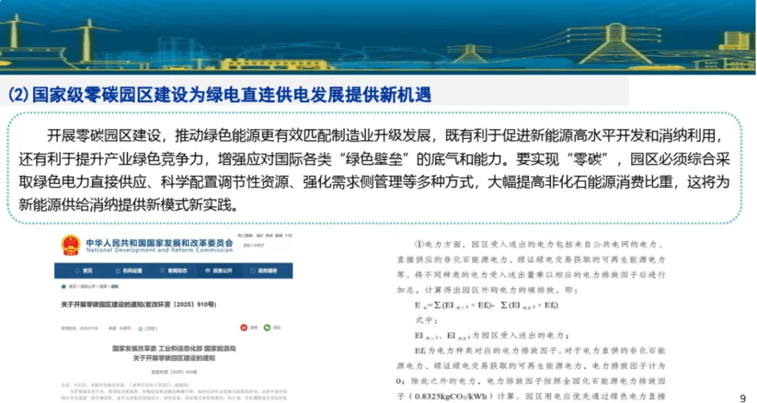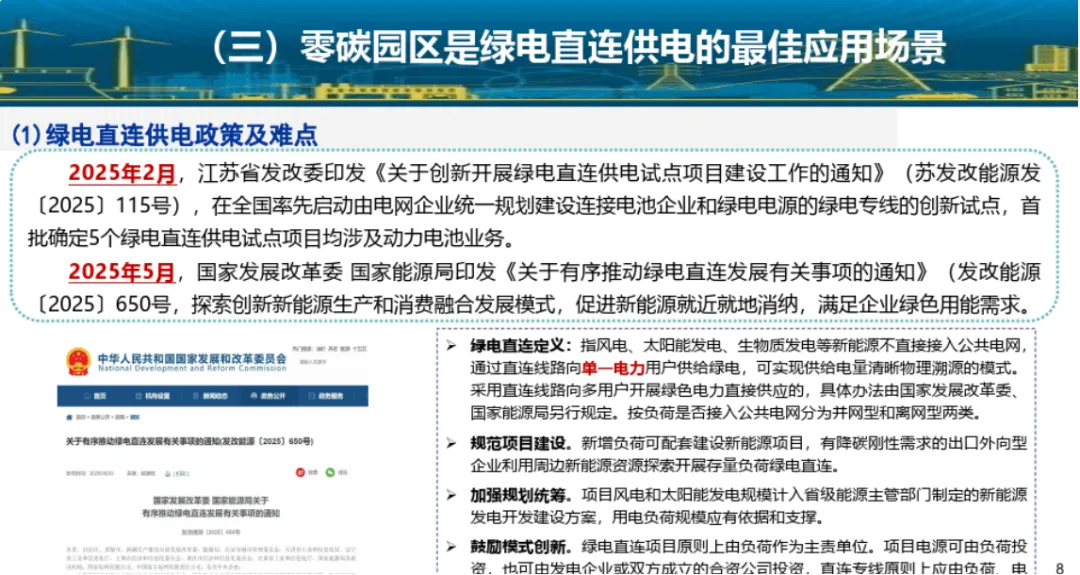 2025年5月,国家发展改革委、国家能源局印发《关于有序推动绿电直连发展有关事项的通知》,明确绿电直连是指新能源不直接接入公共电网,通过直连线路向单一电力用户供给绿电的模式,可实现供给电量清晰物理溯源,这为零碳园区就近消纳新能源提供了政策支撑。