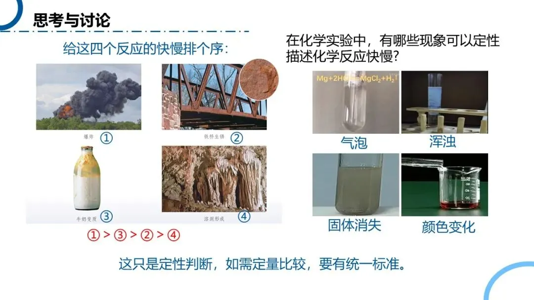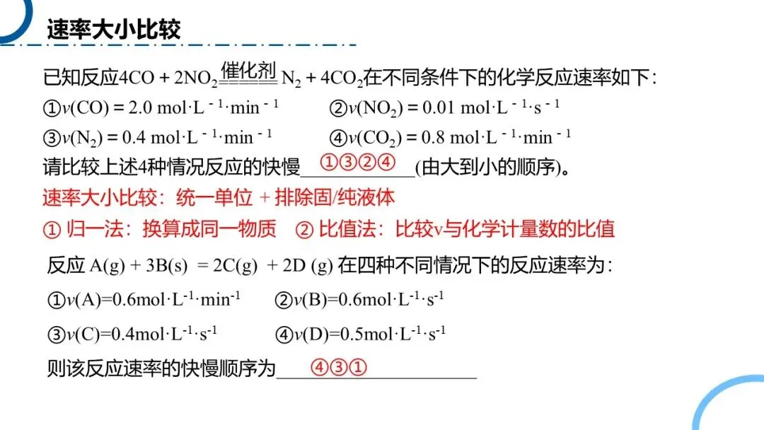 这一节学习化学反应速率,从定性到定量,从物理的速度类比认识化学反应速率的定义、公式和单位,然后通过一些练习引出注意事项,再学习速率大小比较,初步掌握图像判断方法