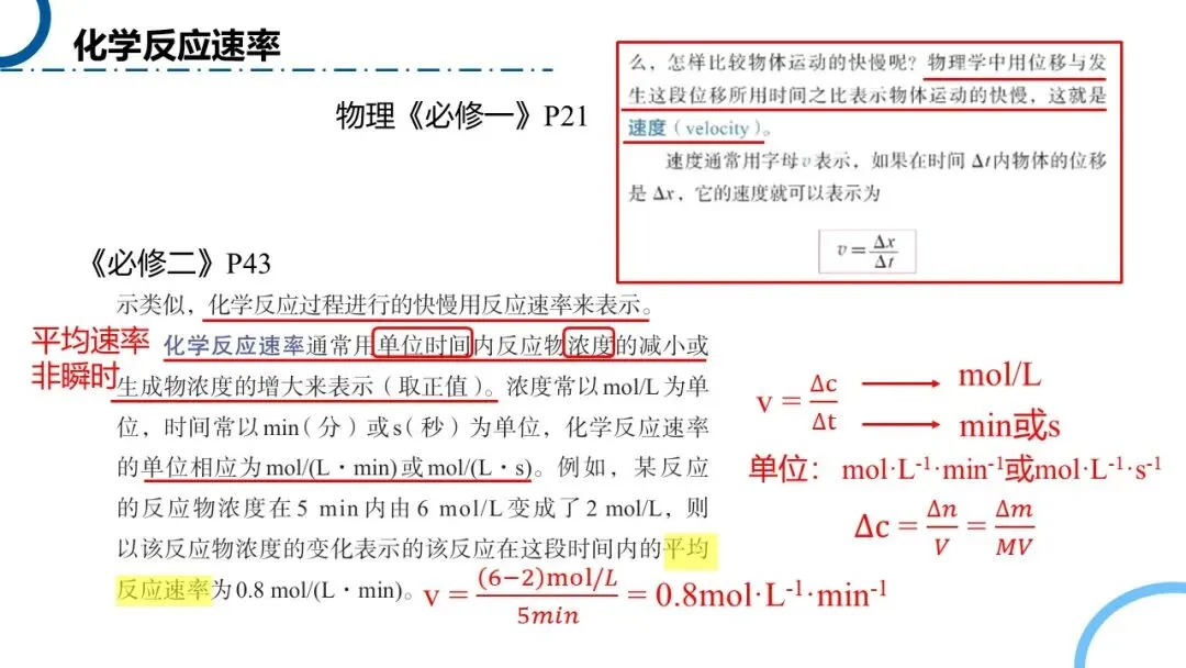 从物理的定义引出化学反应速率的定义,同时比较两者的不同(矢量和标量、平均和瞬时的区别)