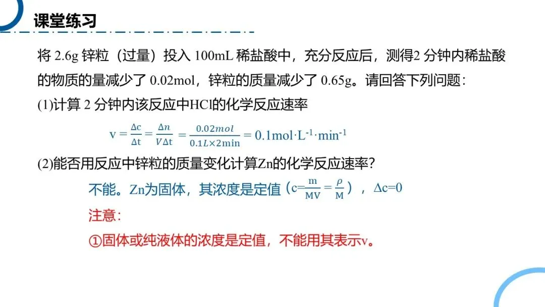 通过例子熟悉公式的运用,引出固体不能表示反应速率。