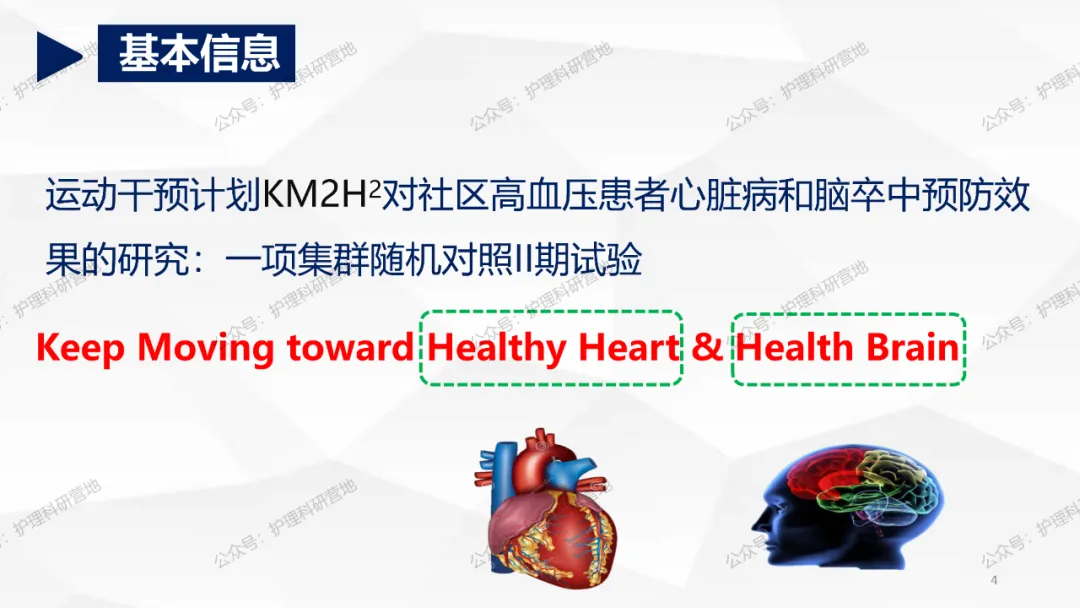该试验的目的是促进社区高血压患者保持两个健康,即心脏健康和大脑健康,从而预防心脏病和脑卒中的发生。所以,该项目命名为:KM2H2