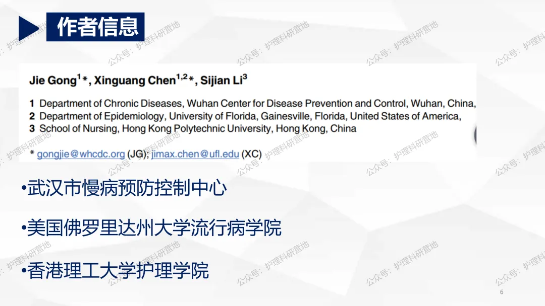 这是文章的作者信息,文章的三位作者分别来自武汉市慢病防控中心,美国佛罗里达州大学流行病学院以及香港理工大学护理学院。
