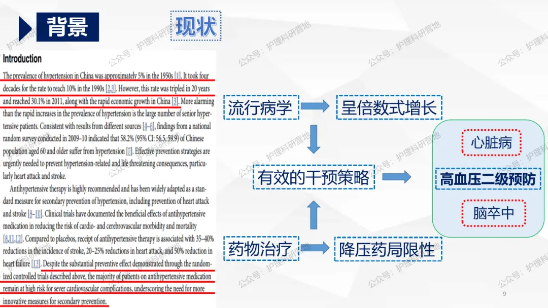 文章的背景部分,首先介绍了高血压目前的现状:从流行病学呈倍数式增长及药物治疗的局限性引出有效的干预策略对高血压二级预防的必要性,特别是对脑卒中和心脏病的预防。从而引出下文。