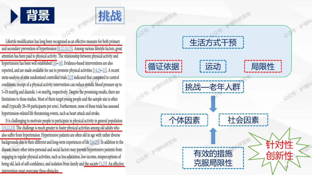 第三段作者指出了生活方式的管理对高血压一、二级预防的重要性,进而提出运动干预对血压控制有效性的循证依据。但是现有研究干预对象多是年轻人,且样本量小。接着文章承上启下——提出了目前的挑战:即针对老年人群,如何制定有效的行为干预策略克服个体因素和社会因素的阻碍,鼓励更多的老年人参与运动锻炼。更具针对性和创新性。这是文章的一大亮点。