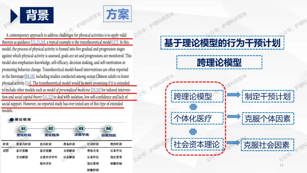 基于以上的依据,文章第五段提出解决方法——基于理论模型指导的行为干预计划。一个典型的例子就是跨理论模型,也称行为分阶段转变理论模型。本文最大的一个亮点:是作者提出跨理论结合个体化医疗模式、社会资本理论整合应用,既克服了单一模式本身的缺陷,又呼应了文章第4段提到的目前的挑战:个体化医疗模式克服了老年人群个体因素的阻碍,社会资本理论克服了社会因素的阻碍。多种理论模式整合应用,最大限度地发挥理论模型的指导价值。该文章是首次采用此种多理论整合方式。体现了文章的创新价值。