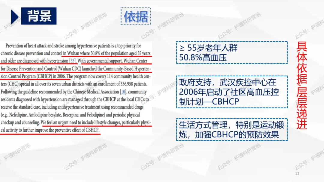 前五段作者交代了宏观的背景,在第六段,作者从微观角度,交代了项目实施的具体背景:基于武汉市高血压流行率高,由政府支持,武汉疾控中心在2006年启动了社区高血压控制计划—CBHCP,包括服用降压药、定期体检、健康咨询。进一步引出,迫切需要生活方式管理,特别是运动锻炼,加强该计划的预防效果。提出了具体依据,并且层层递进。