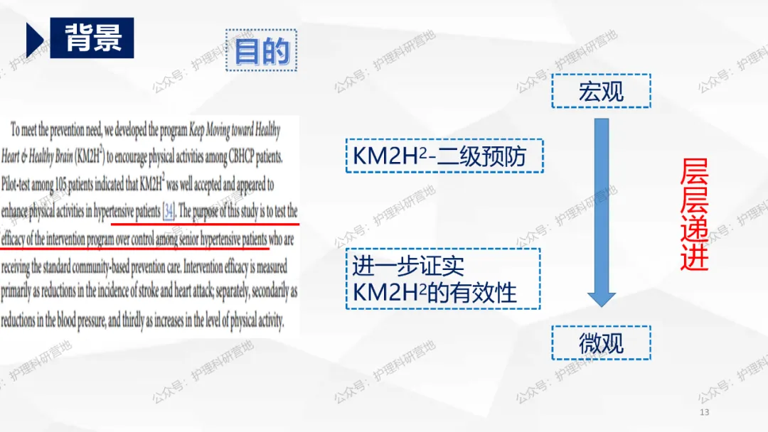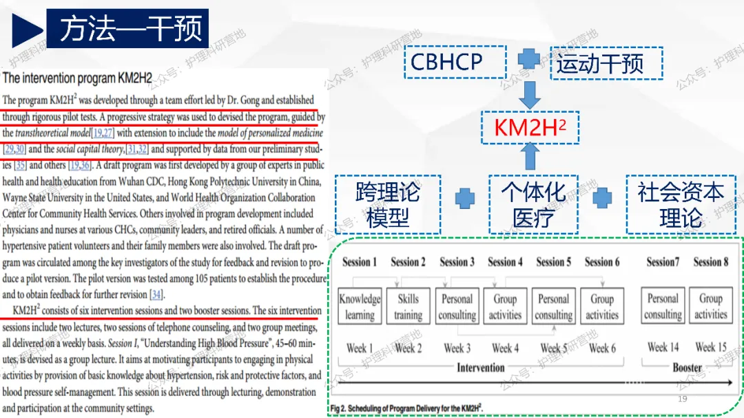 整个背景部分,作者从宏观现状、目前的挑战、解决的方案再到微观的具体依据,层层递进,最后引出本文的目的,进一步证明KM2H作为高血压二级预防行为干预策略项目的有效性。这篇文章的背景部分写得很全面,内容架构的逻辑性也很强,这是值得我们学习的地方。