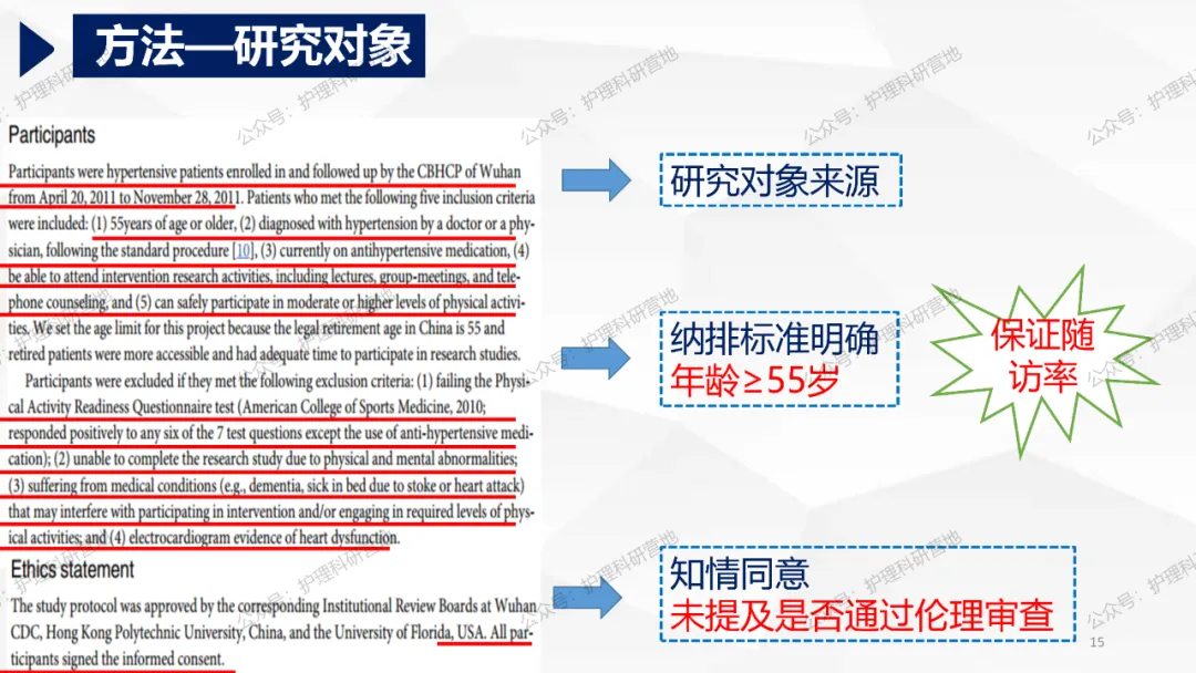 本文的研究对象是来自武汉市社区卫生服务中心,其纳排标准非常明确,作者特别交待纳入年龄≥55周岁,是因为我国的法定退休年龄为55周岁,这部分人群有更多的时间参与社区研究,可以减少失访率。并且受试者均需签署知情同意书,但文章的一个缺点是并未提及是否通过了伦理审查。