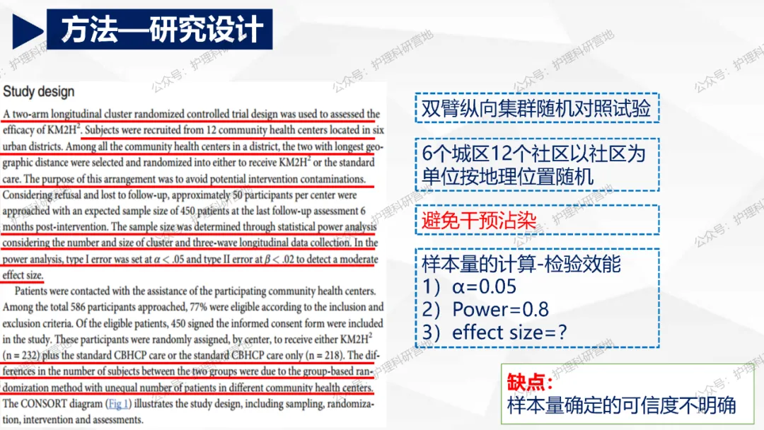 本文的研究设计采用的是双臂纵向集群随机随机对照试验,即将6个城区共12个社区以社区为单位,按地理位置随机,这样做是为了避免干预沾染,保证实验结果的可信度。样本量计算采用的是检验效能,但是文中没有给出具体的效应值,不确定这里的效能是事先效能还是事后效能。所以,样本量确定的可信度并不明确。
