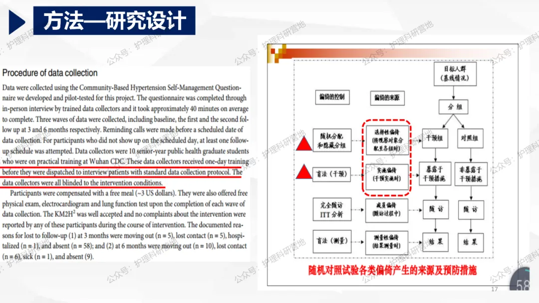 文章的数据处理部分,作者提到对结果测评者设盲,减少了测量偏倚,对于随访过程中的减员偏倚,采用了完全随访意向性析,设计严谨,但是由于实施难度,没有对研究人员和干预对象设盲,因此一定程度上增加了实验的选择性偏倚和实施偏倚。