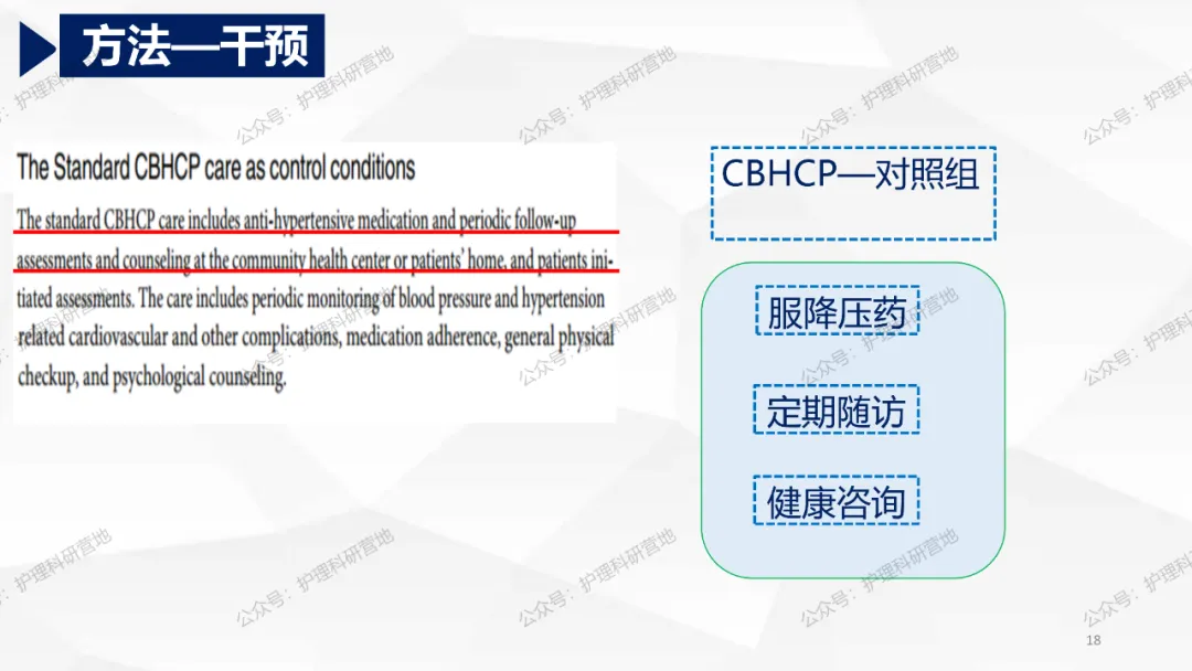 在干预方式上,对照组实施了社区高血压控制计划,给予常规社区高血压管理项目,包括服降压药,定期随访评估,健康咨询。