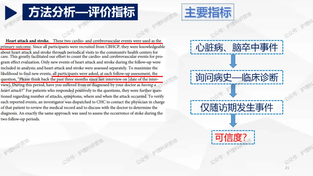主要结局指标包括随访期间诊断的心脏病和脑卒中事件。文中提到的这两个指标是通过询问病史获得,但是并没有考虑到慢性病潜伏病程较长,所以这种方式的可信度难以确定。