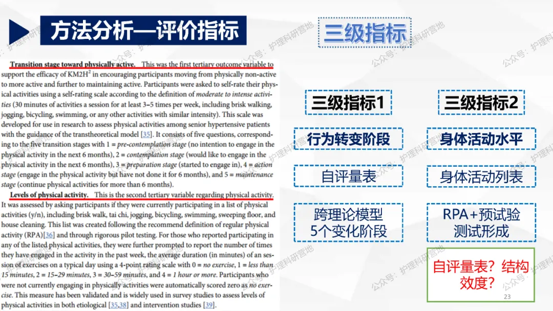它的三级指标有2个,分别是行为转变阶段和身体活动水平。这两个评价均是由预试验形成的自评量表完成。但是量表的结构效度是否需要进一步通过验证性因子分析和探索性因子分析,作者在这里没有交代。