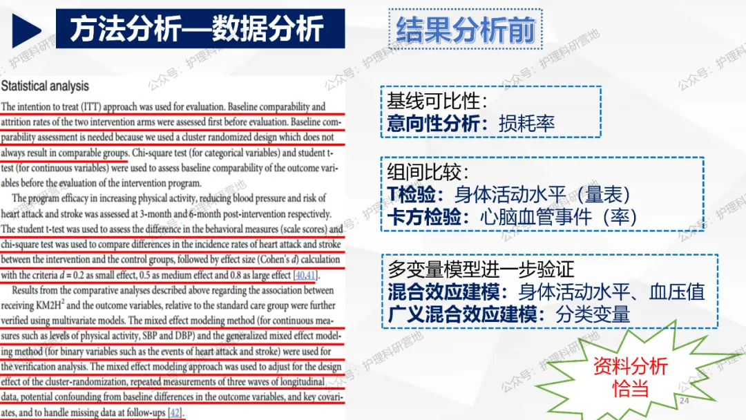 数据分析部分,作者交代详细。采用意向性分析,两组资料基线可比。组间连续变量采用T检验,分类资料采用卡方检验。并且采用多变量模型对统计结果做了进一步验证。资料分析恰当。但对于混合效应建模的相关内容,还需要进一步的学习。