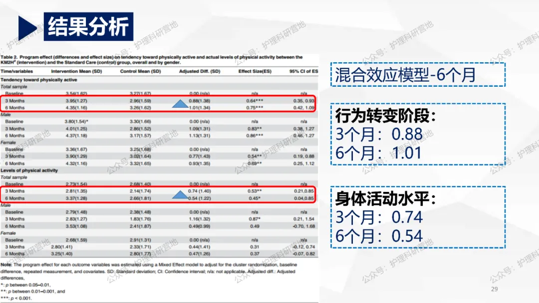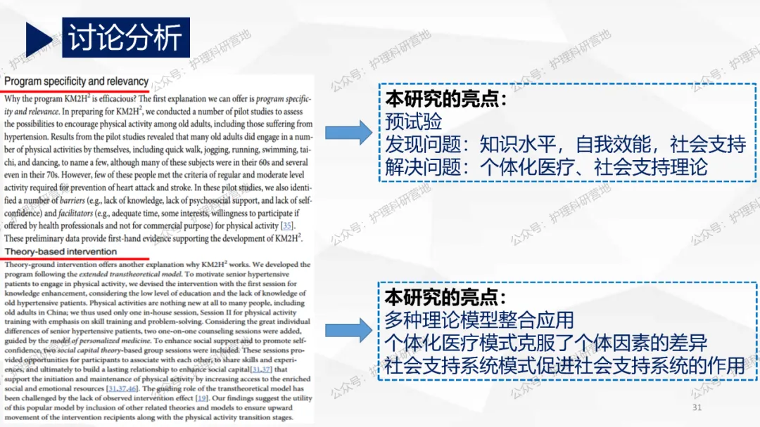 本文研究的亮点是作者通过预试验,发现了社区老年群体参与体育活动的一些问题如知识、自我效能和社会支持的缺乏,并针对存在的问题提出了解决方案。同时整合多种理论模式,个体化医疗解决了个体因素的阻碍,社会支持理论解决了支持系统的阻碍。使得干预效果更具针对性。并且强化了理论的指导意义。