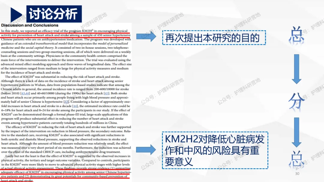 在讨论部分,作者采用总分总的写作方式,首先再次提出本次研究的目的,然后分别讨论了KM2H2对心脑血管事件、血压、身体活动的疗效。最后点题:KM2H2对降低心脏病发作和中风的风险具有重要意义。