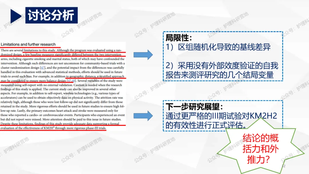 文章也存在一定的局限性,比如社区实验,一般采用的区组随机化会导致组间基线的差异。其次,对几个结局指标采用自我报告的方式测评,量表没有经过外部效度验证,实验结论的概括力和外推力会受到影响。所以,作者提出了下一步的研究展望:希望通过设计更严格的III期实验对KM2H2的有效性进行正式评估。但是结论的概括力和外推力还需进一步的验证。