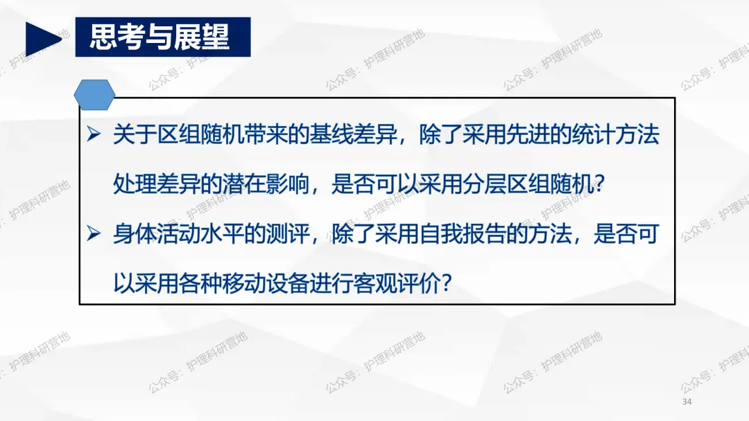 我的思考与展望主要有以下两点,第一,关于区组随机带来的基线差异,除了采用先进的统计方法处理差异的潜在影响,是否可以采用分层区组随机?第二,身体活动水平的测评,除了采用自我报告的方法,是否可以采用各种移动设备进行客观评价?