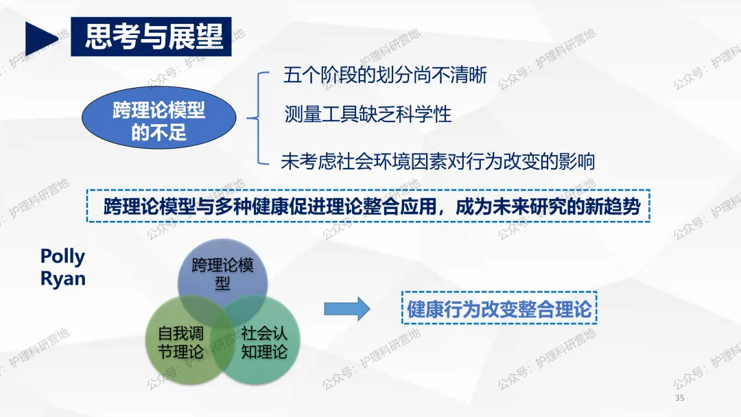 将跨理论模型运用于糖尿病运动干预可能会是我今后的研究方向,虽然解读的这篇SCI不是和糖尿病相关的,但是文章中有关慢性病的运动干预项目,以及将跨理论模型与多种理论整合运用能够为今后的研究提供思路。目前跨理论模型主要存在一些不足之处,比如它的五个阶段的划分尚不清晰、测量工具缺乏科学性以及未考虑社会环境因素对行为改变的影响。而将跨理论模型与多种健康促进理论整合应用,会成为未来研究的新趋势。美国的临床护理学家在2009年提出了健康行为改变整合理论,将跨理论模型、自我调节理论以及社会认知理论进行整合,集合多种健康教育理论的核心精神,能够更全面的进行科学理论的指导。因此我想今后的研究中尝试将该理论运用于糖尿病患者的运动中,更好的指导患者的行为改变。