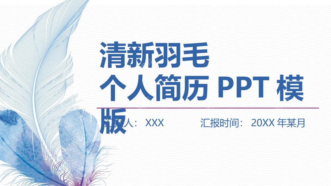 这是一份PPT演示文稿,整体采用清新羽毛风格设计,适用于个人简历展示汇报,包含汇报人、汇报时间等基础信息板块,可用于求职者展示个人经历、能力等内容,风格简约清新,适配多种求职汇报场景。